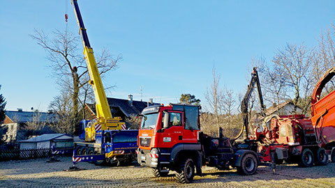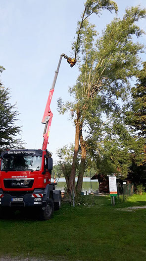 Ist die Verkehrssicherheit eines Baumes nicht mehr gewährleistet und kann diese durch entsprechende Pflegemaßnahmen nicht mehr wiederhergestellt werden, so muss dieser gefällt werden. Wir führen Gefahrbaumfällungen von Problembäumen bzw. geplante Fällungen aus anderen Gründen (z.B. Bauarbeiten) je nach Einsatzgebiet mit dem Autokran, einer Hubarbeitsbühne oder mittels Seilklettertechnik durch - je nach Bebauung werden die Bäume stückweise abgetragen bzw. Ast- und Stammstück abgeseilt.